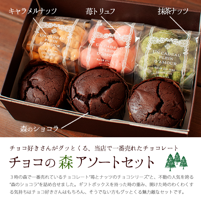 ◆チョコの森アソートセット(6個入)森のショコラ3個・キャラメルナッツ70g・抹茶ナッツ70g・苺トリュフ60g
