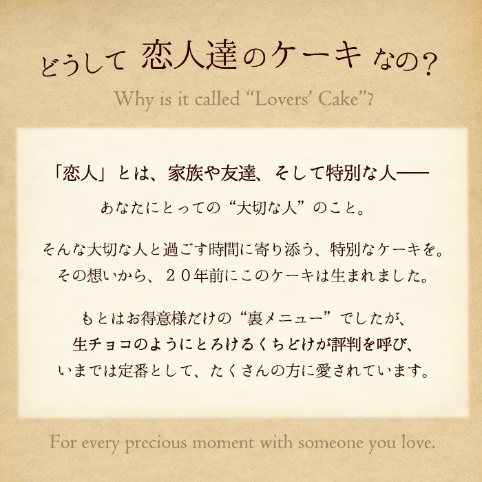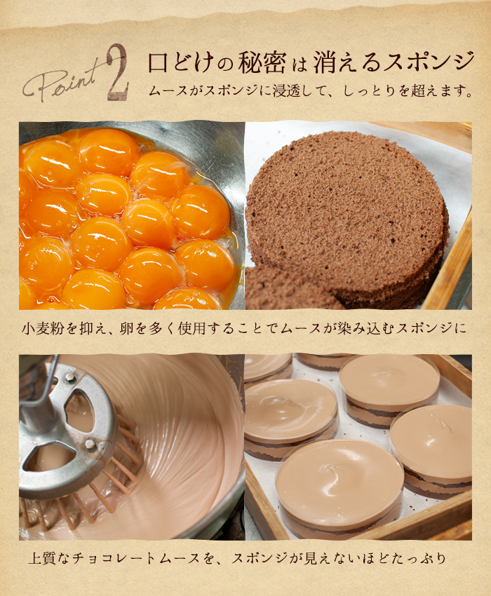 通常スポンジは小麦粉が多く含まれますが、このスポンジは小麦粉を極力抑え、代わりに ココアパウダーとアーモンドパウダーを使い鶏卵を多く使用する事で、チョコレートムースがスポンジに濃密に浸透します。お口に入れるとスポンジが消えたような口どけに驚くと思います。