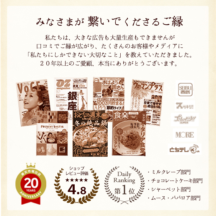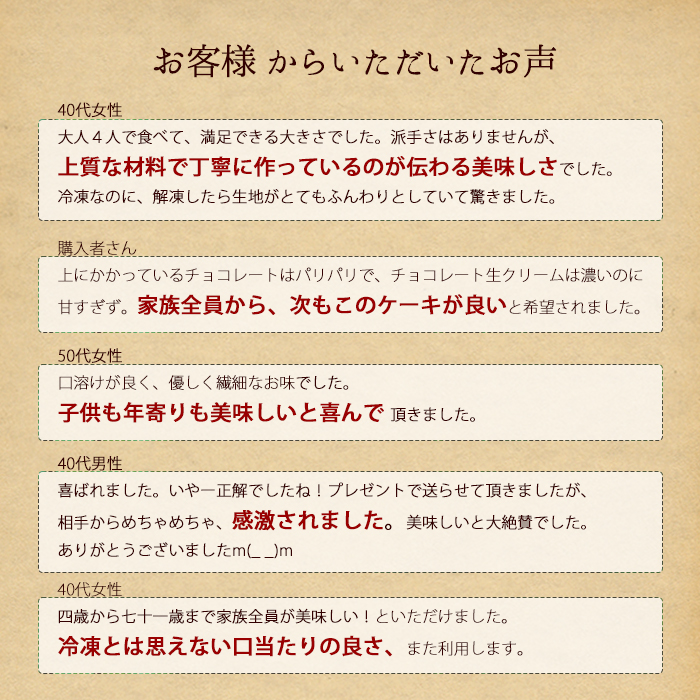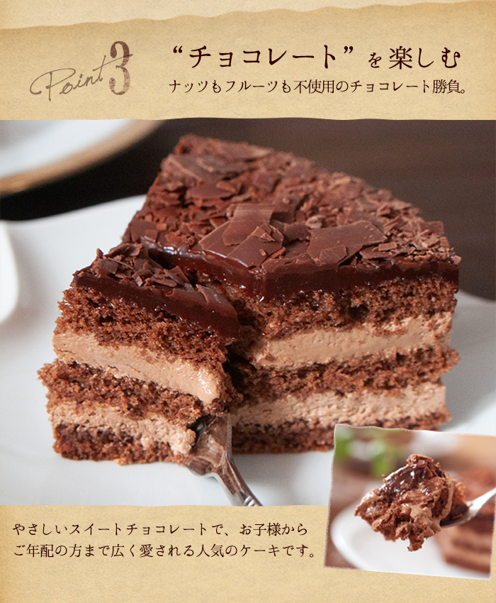 ◆原材料名:スイートチョコ(国内製造)乳等を主要原料とする食品、卵、砂糖、牛乳、生クリーム、小麦粉、ココアパウダー、アーモンドパウダー、水あめ、蜂蜜、ゼラチン、ブランデー/香料(一部に乳成分・卵・小麦・アーモンド・ゼラチン・大豆を含む)※上部に乗っているチョコレートは予告なく変更になる場合がございます。ご了承ください。