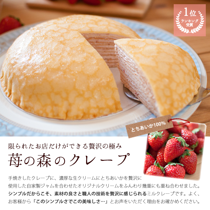 バースデーケーキにも。那須高原の牛乳、太陽の卵を使用し、一枚一枚手焼きのクレープ生地と北海道産の生クリームにとちあいかを贅沢に使用した苺クリームをたっぷりサンドした苺の森のクレープ(ミルクレープ)です。